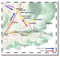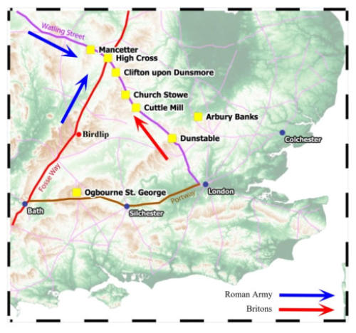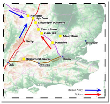 Britons attacking from the area of London toward the Roman forces concentrating from the direction of