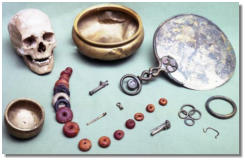placed over the woman’s face), bracelets, the stylized face of a bird in a silver gilt brooch, a pair of tweezers,